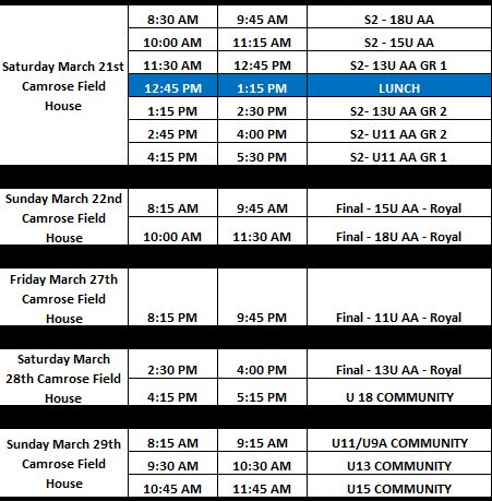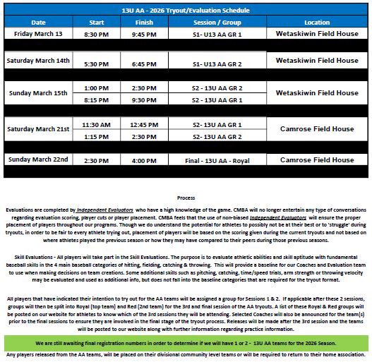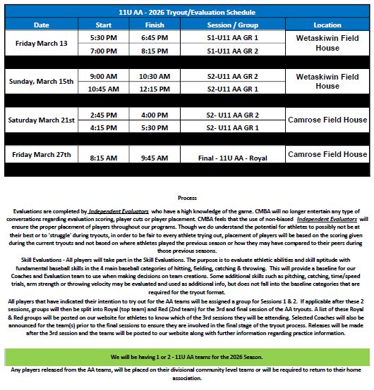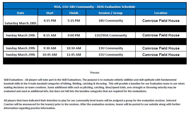 2026 AA Tryout and Community Evaluation Schedules are listed below
